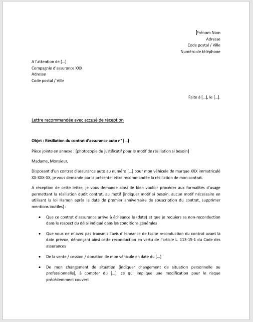 Télécharger la lettre type de résiliation de l'assurance auto :