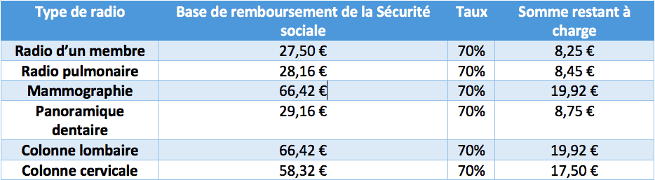 Selon le type de radio que vous allez passer, la Sécurité Sociale ne vous rembourse pas le même montant. À titre d’exemple, voici un tableau présentant quelques tarifs de remboursements de la Sécurité Sociale :